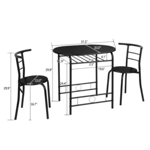 The VINGLI 3-Piece Bistro Dining Set is a stylish and space-saving solution for small spaces like apartments, kitchens, or dining rooms. Featuring a durable metal frame and a wooden tabletop with a wine rack, this compact dining set combines functionality and contemporary design. The set includes a sleek table and two matching chairs, perfect for casual dining or morning coffee. Made with high-quality MDF hardwood and fiberboard, it offers durability without requiring any power source. Available in a classic black finish, it’s ideal for modern interiors while providing both comfort and convenience.