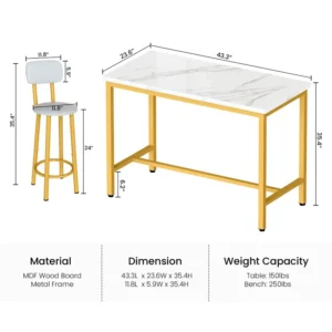 The MULTIGOT 3-Piece Dining Table Set combines style and functionality, making it perfect for small spaces. This set includes a rectangular table with a faux marble top and two upholstered stools, offering comfortable seating for two. The 2-tier storage shelf provides a practical solution for storing essentials or displaying décor. Constructed with a sturdy metal frame and manufactured wood, it ensures long-lasting durability. Its modern design makes it an elegant addition to kitchens or dining rooms, while its compact size is ideal for apartments or cozy dining areas. Enjoy both convenience and sophistication with this space-saving dining set.
