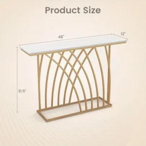The TANGKULA 48″ Gold Console Table combines modern design with functionality. Featuring a stunning white faux marble tabletop and a geometric gold base, this narrow console table is perfect for entryways, hallways, or behind sofas. It offers ample space for decorative items or storage, with a closed storage capacity of under 3.2 cubic feet. Its light yellow finish adds a touch of elegance, while the sturdy wood construction ensures durability. Whether for modernizing your living room or enhancing your hallway, this console table brings both style and practicality to any space.