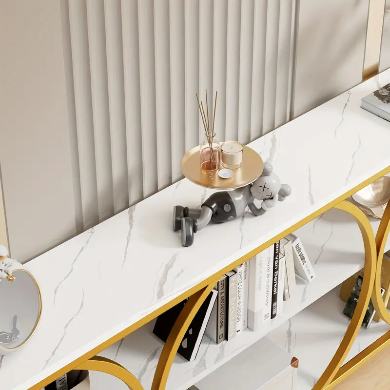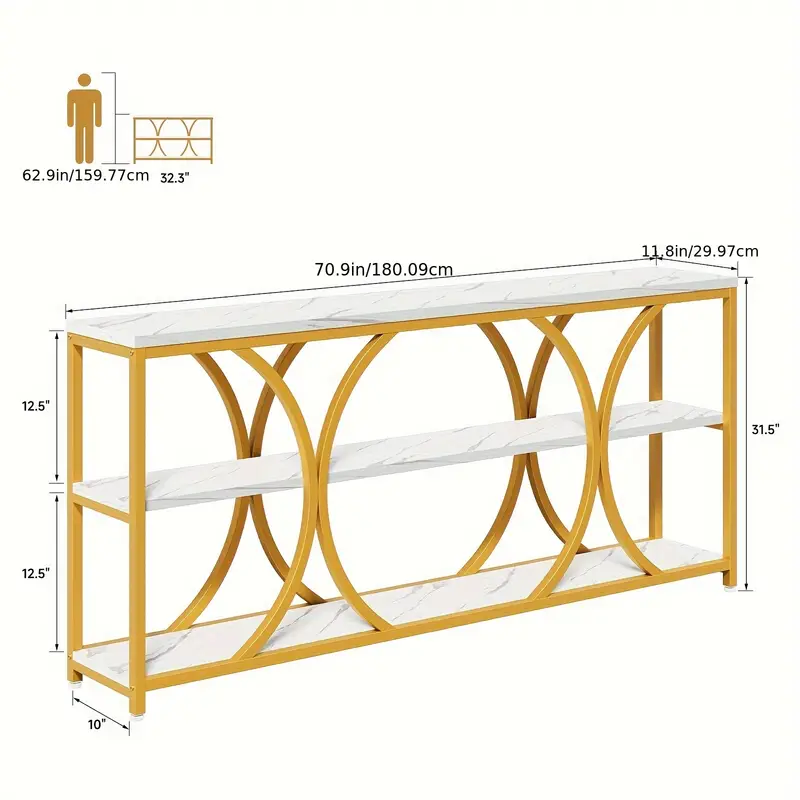 Add elegance and functionality to your space with the 70.8″ Gold Console Table. Featuring a modern design, this narrow table combines a sturdy gold metal frame with a white faux slate tabletop for a sophisticated touch. The three-tier design offers ample storage for books, décor, or essentials, making it ideal for entryways, hallways, or behind sofas. Constructed with durable wood and particle board, this table is built to last. With no electricity required, it’s an eco-friendly and stylish solution for any home. Perfectly blends practicality and elegance to elevate your living space.