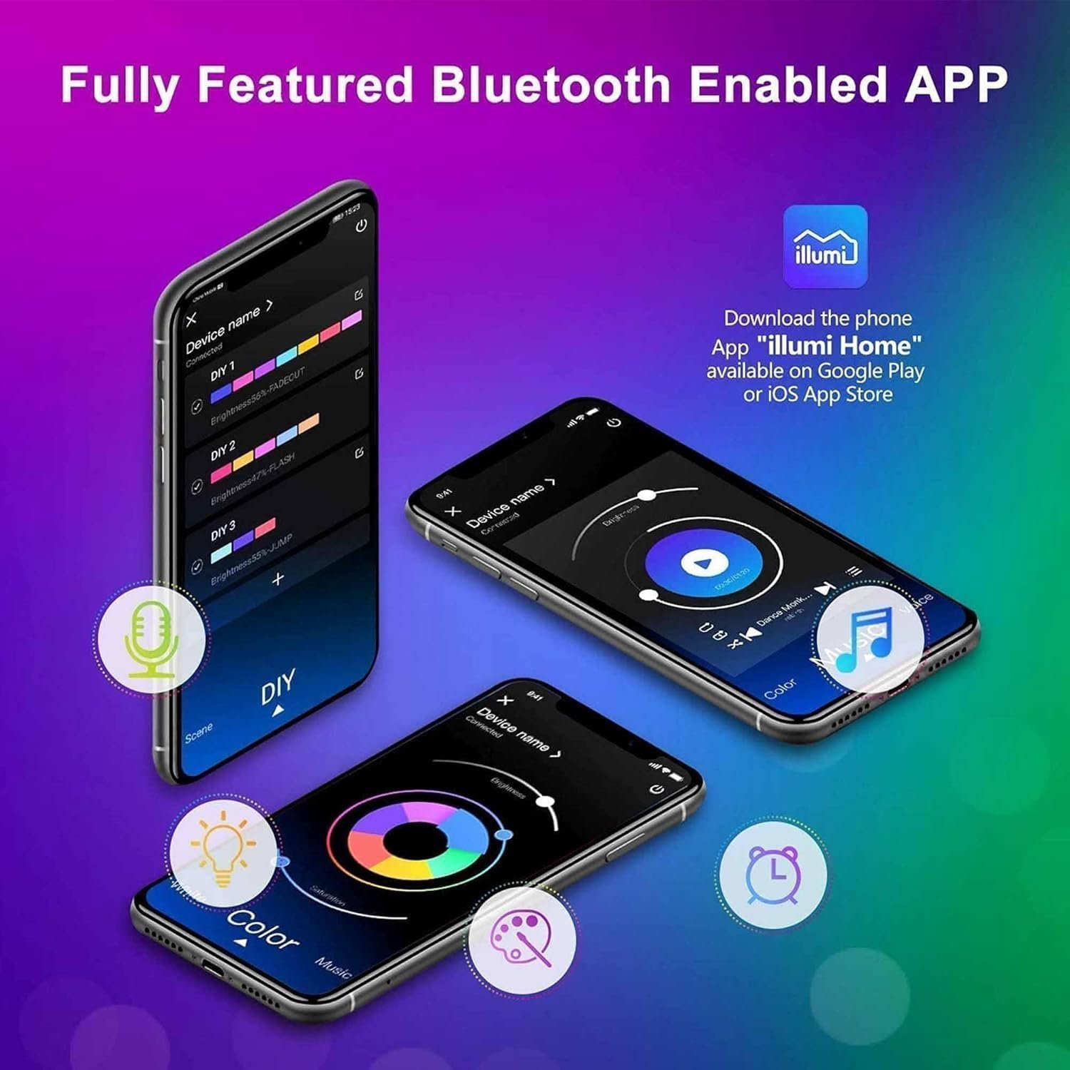 • Multi-way to control: Come with 44-key remote and phone App control(“Illumi home” available on Google Play and iOS App Store), you can adjust the brightness, change color, on/off the lights. Come with sensitive built-in mic, lights will pulsate and change colors along with the environmental sound and music when you set to music mode.(Connectors are not included.)