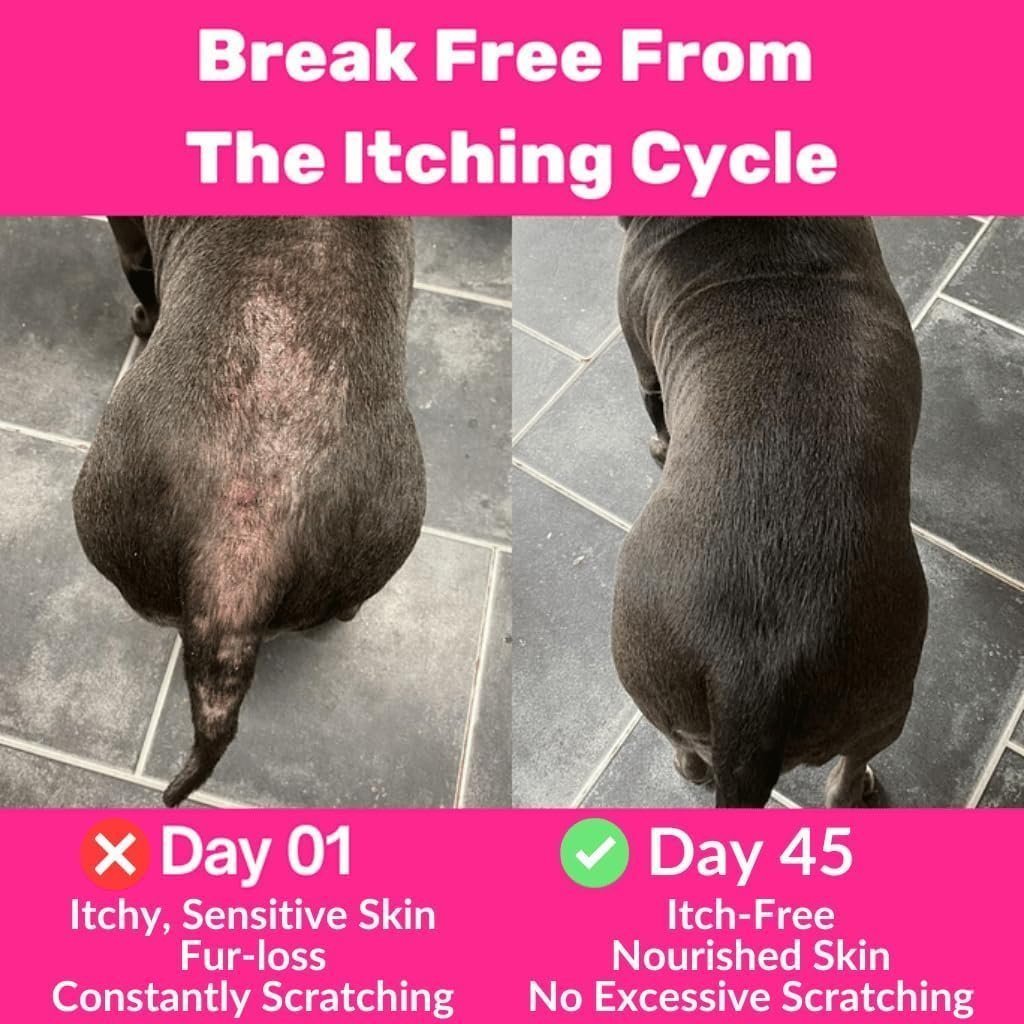 - No More Force Feeding Tablets – Packed with world-class, expertly selected natural ingredients made into tasty, mouthwatering Salmon flavoured treats to soothe your itchy dog all year round